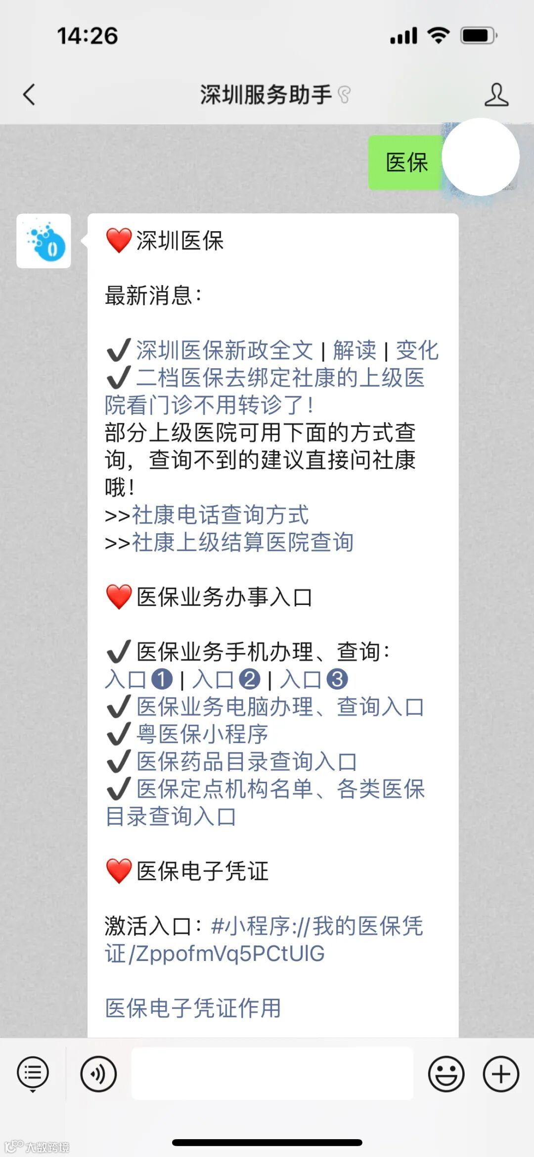 可以点击下方名片【深圳服务助手】公众号,在微信聊天对话框发送【医保】,即可获取入口(查询办理都是同一入口)