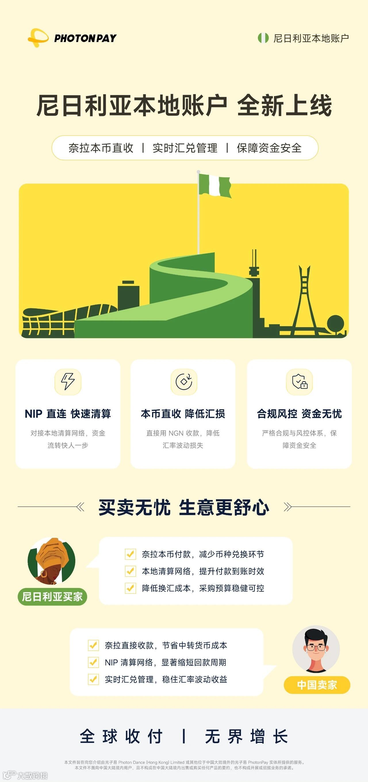 PhotonPay光子易正式上线尼日利亚本地账户。我们致力于打破传统资金链路的结构性枷锁,让企业不再受限于回款效率与合规壁垒,将重心回归业务增长本身,从容“抢滩”非洲新兴市场。