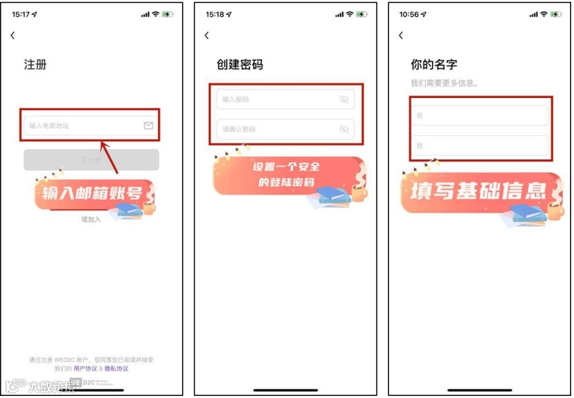 当你通过电脑网址或者通过下载手机 APP 进入下 WED2C 页面后,就 可以注册属于你的账号啦,以下是手机端的页面示意,具体步骤如下:点击页面右下角的“我的”→点击“登陆”→点击“注册”——输入 邮箱——创建密码——填写基本信息——注册完成