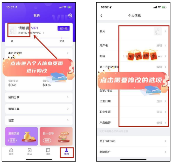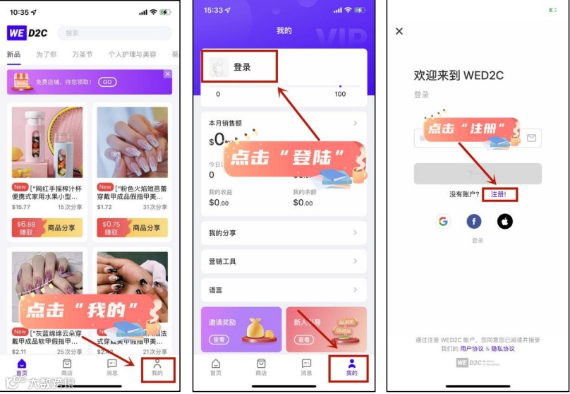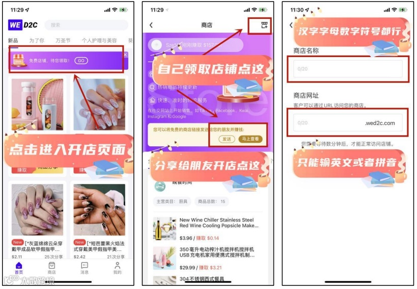 当你成功下载注册完 WED2C 时,打开 APP 首页,可以在页面顶端看 到“免费店铺,待您领取”的字样,然后点击进入领取店铺页面,进 入之后点击右上角的商店标识,然后依次填入相应的信息,这样你就 可以创建一个自己的商店啦~