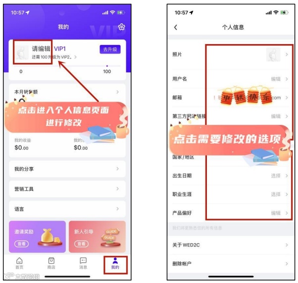 如果在注册的阶段没有填写个人信息,或者填写了,但是想要修改自 己的个人信息,那可以点击“我的”——点击“名字“”——进入个 人信息页面——点击需要修改项,逐一进行修改。