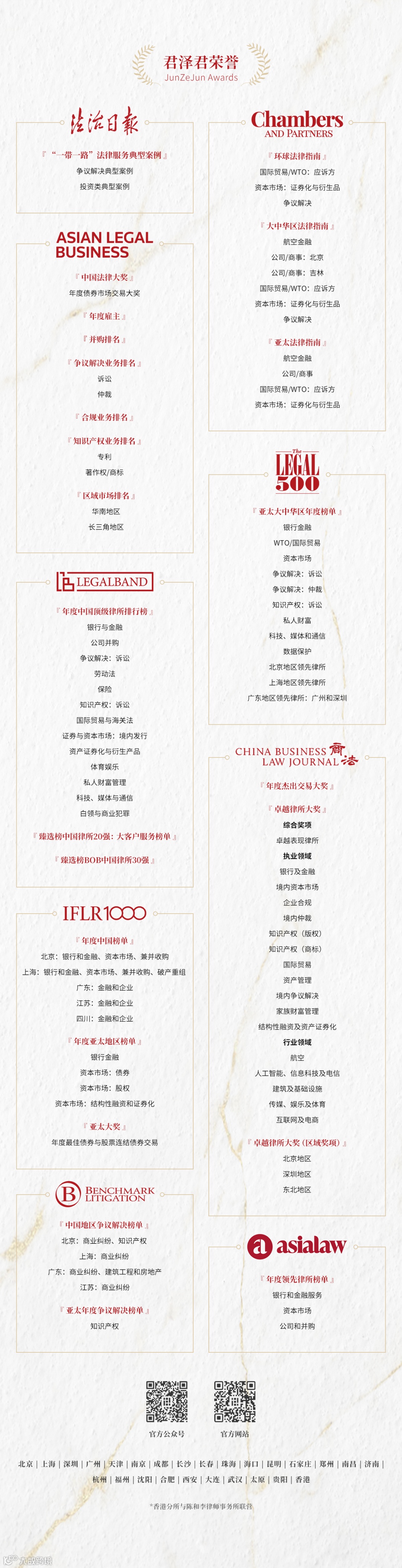 君泽君律师事务所一贯倡导并践行以服务客户为核心,深化专业分工,优化及灵活配置法律服务资源的理念,使君泽君能够为来自不同产业和专业领域的客户提供高品质、个性化和增值型的法律服务。多年来,君泽君拥有广泛及稳固的客户群体,其中既包括百余家境内外主要金融机构、近百家世界五百强企业及跨国集团,也包括一大批国有企业、上市公司和大型民营企业集团,同时也为相关政府机构、国际组织、专业行业协会等机构提供法律服务。