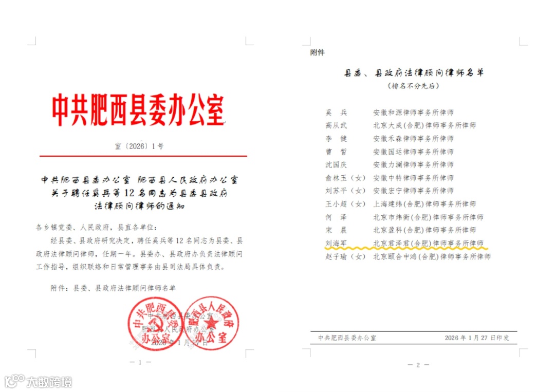 近日,北京君泽君(合肥)律师事务所合伙人刘海军律师正式获聘为肥西县委、县政府法律顾问,聘期一年。此次聘任充分体现了肥西县委、县政府对君泽君合肥分所专业能力的认可,以及对刘海军律师在政府法律服务领域专业素养的充分肯定。