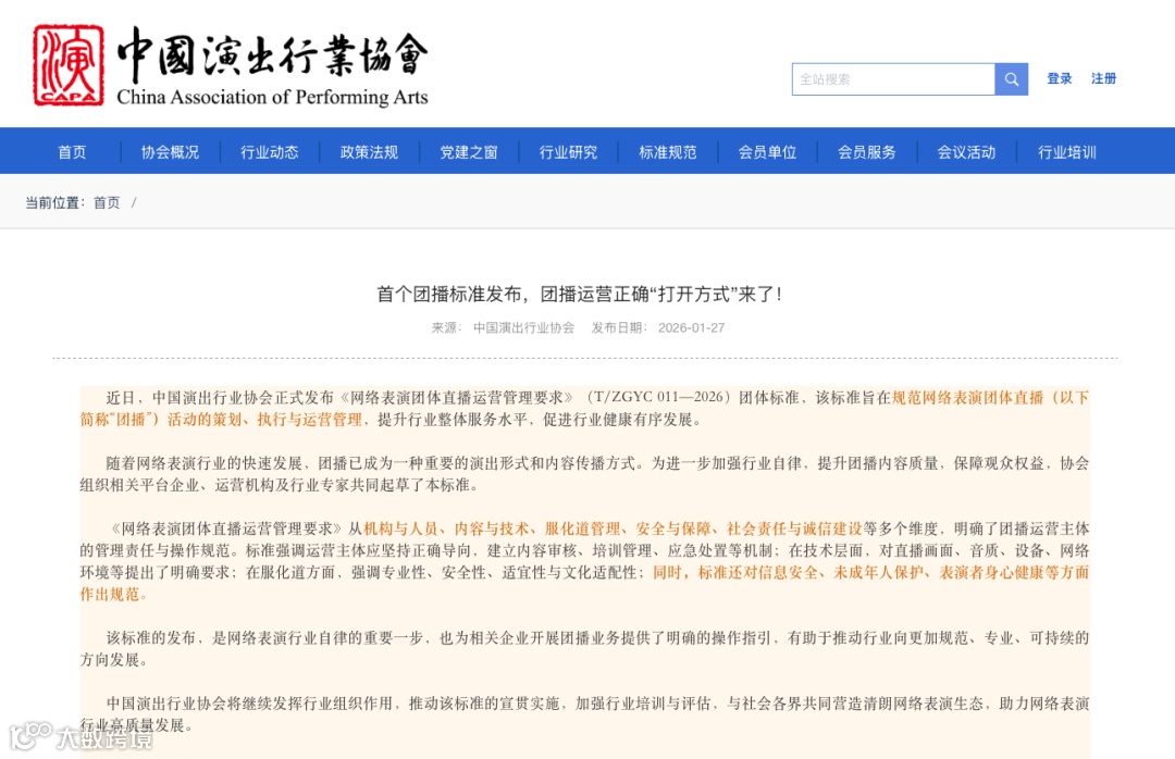 近日,中国演出行业协会正式发布《网络表演团体直播运营管理要求》(T/ZGYC 011—2026)团体标准,该标准旨在规范网络表演团体直播(以下简称“团播”)活动的策划、执行与运营管理,提升行业整体服务水平,促进行业健康有序发展。随着网络表演行业的快速发展,团播已成为一种重要的演出形式和内容传播方式。为进一步加强行业自律,提升团播内容质量,保障观众权益,协会组织相关平台企业、运营机构及行业专家共同起草了本标准。