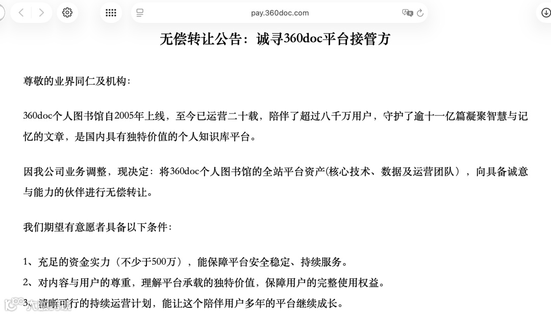 根据360doc个人图书馆1月24日发布的公告,因公司业务调整,现决定将360doc个人图书馆的全站平台资产(核心技术、数据及运营团队),向具备诚意与能力的伙伴进行无偿转让。公告中还列出了360doc个人图书馆团队期望有意愿者具备的条件,其中包括充足的资金实力(不少于500万元),能保障平台安全稳定、持续服务;对内容与用户的尊重,理解平台承载的独特价值,保障用户的完整使用权益;清晰可行的持续运营计划,能让这个陪伴用户多年的平台继续成长。