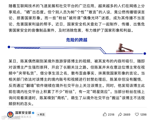 近日,国家安全机关成功查处一起制作、传播、出售危害国家安全音像制品的案件,涉案人员陈某因触犯法律面临严惩。经查,陈某被某境外旅游穿搭博主吸引后,对其长期关注。该博主常借分享生活之名散布歪曲事实、抹黑国家形象的言论,账号被依法封禁后,陈某仍通过 “翻墙” 软件持续关注,并嗅到 “商机”。他通过录屏、二次剪辑等方式,将博主在境外平台发布的不法视频倒卖给境内用户,累计传播此类视频数十条,非法获利数万元,覆盖受众千余人。