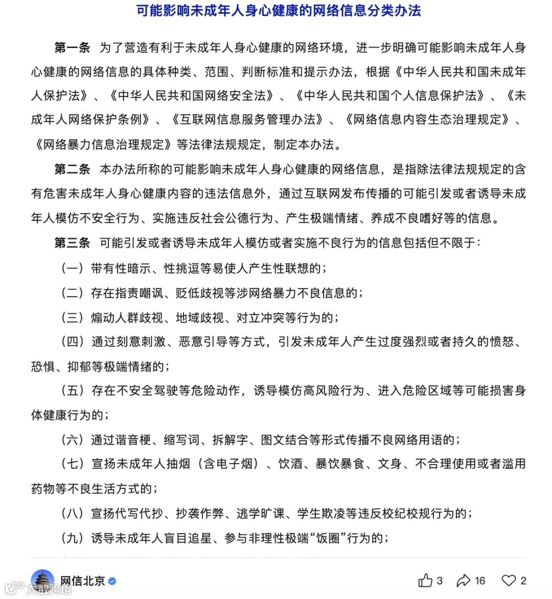 近日,国家互联网信息办公室、国家新闻出版署、国家电影局、教育部、工业和信息化部、公安部、文化和旅游部、国家广播电视总局发布《可能影响未成年人身心健康的网络信息分类办法》(以下简称《办法》),自2026年3月1日起施行。《办法》落实《未成年人网络保护条例》要求,明确可能影响未成年人身心健康的网络信息的4种类型及具体表现形式,将不当使用未成年人形象等近年来突出问题纳入治理范围,对算法推荐、生成式人工智能等新技术、新应用、新业态可能带来的内容风险提出防范要求,确保《办法》科学严谨、与时俱进。《办法》要求,对可能影响未成年人身心健康的网络信息,网站平台和内容生产者应当采取防范和抵制措施,避免对未成年人产生负面影响。国家互联网信息办公室有关负责人表示,网信部门将持续净化网络环境,督促网站平台切实履行主体责任,加大对各类可能影响未成年人身心健康的信息内容的治理力度,为未成年人营造清朗网络空间。(来源:网信北京微信公众号)