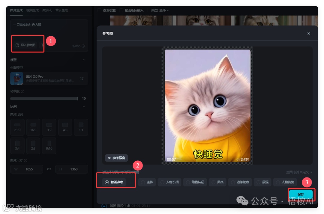 - 方法一:垫图参考 截图他人作品作为参考图上传至即梦,启用“智能参考”功能。注意参考图应无文字,否则会影响生成效果。
