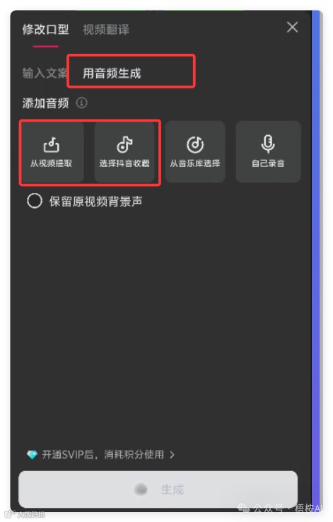 - 在剪映中使用“AI对口型”功能,选择“从视频提取”音频完成匹配。