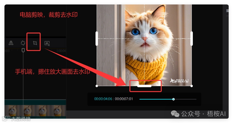 - 将生成的视频片段导入剪映,裁剪去除水印区域;