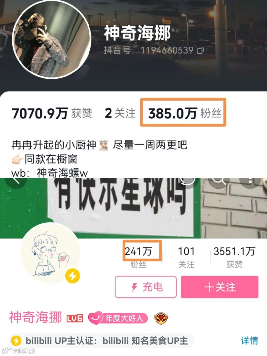 可能很多人不知道神奇海挪是谁,他是活跃在抖音和哔哩哔哩这两个平台上的美食博主。抖音上有385万的粉丝,哔哩哔哩上有241万的粉丝。虽说是美食博主,但是发布的视频中,多以做菜翻车出名。