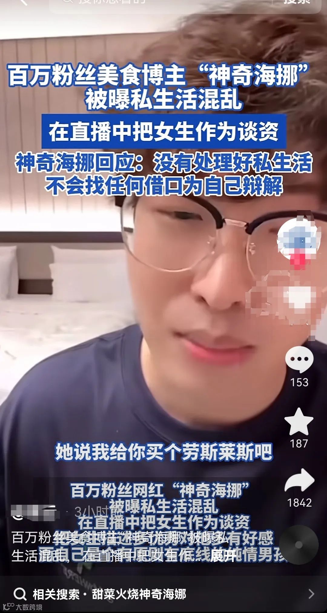 1、美食博主神奇海挪被曝约炮,纯情人设崩塌