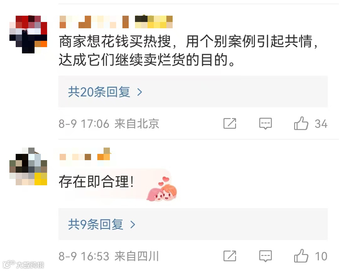 但也有网友说:“存在即合理。”还有人认为是商家花钱买的热搜,利用个别案例引起共情,以达成继续卖烂货的目的。