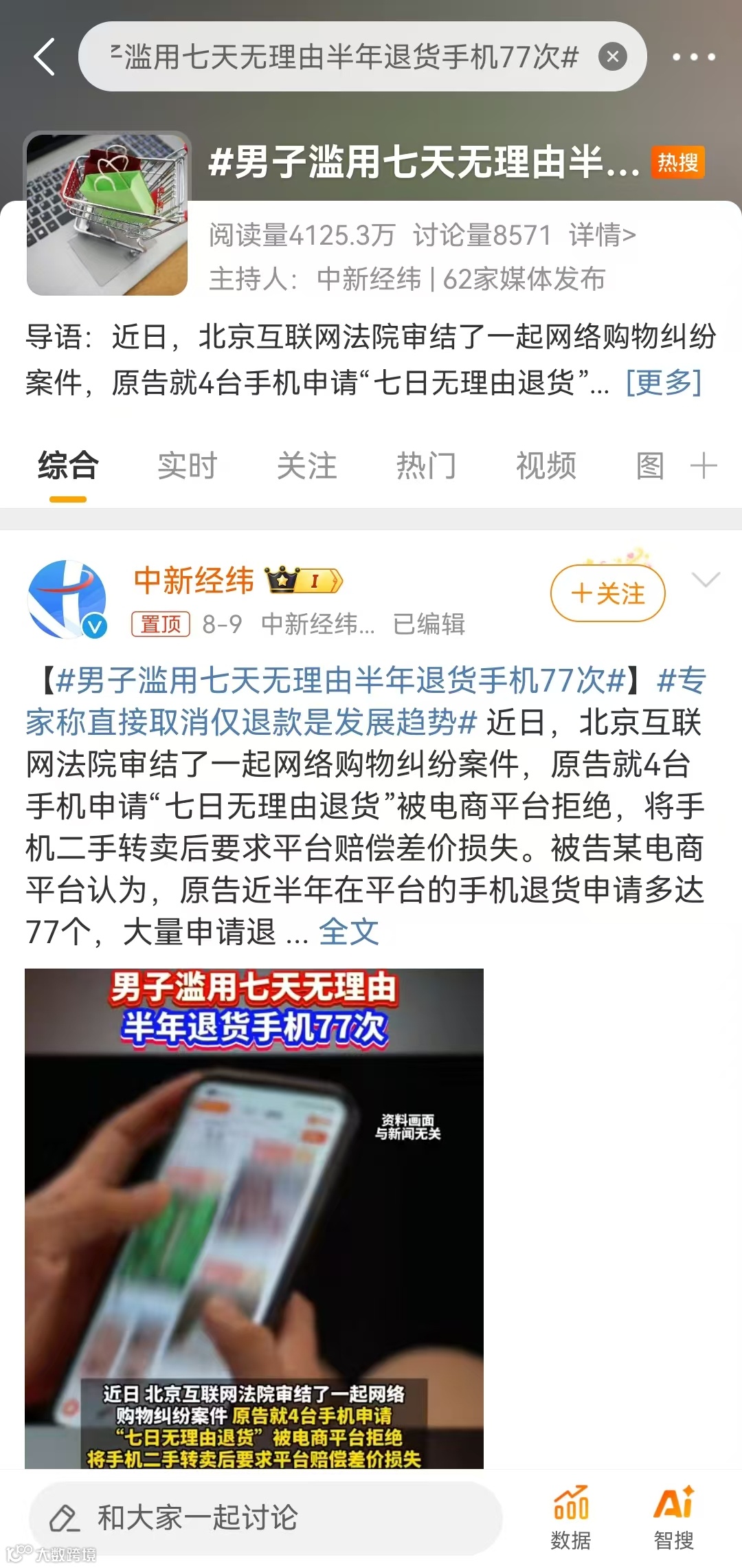 案件一出,媒体们纷纷报道后,词条“男子滥用7天无理由半年退货手机77次”就登上了热搜,引起了广泛的讨论。