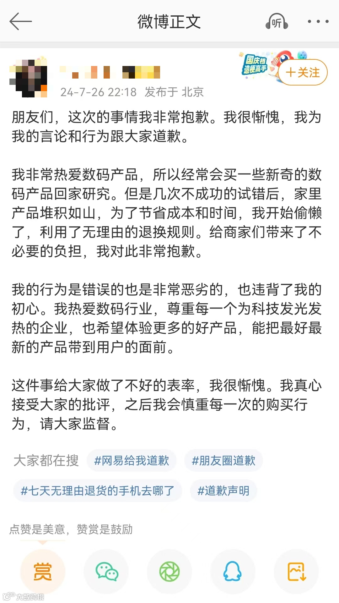 实际上,案件中的这位消费者早就不是第一个滥用“七天无理由退货”权益的人了,今年七月,某知名手机厂商前产品经理就因为这个被网友们痛骂了一顿。