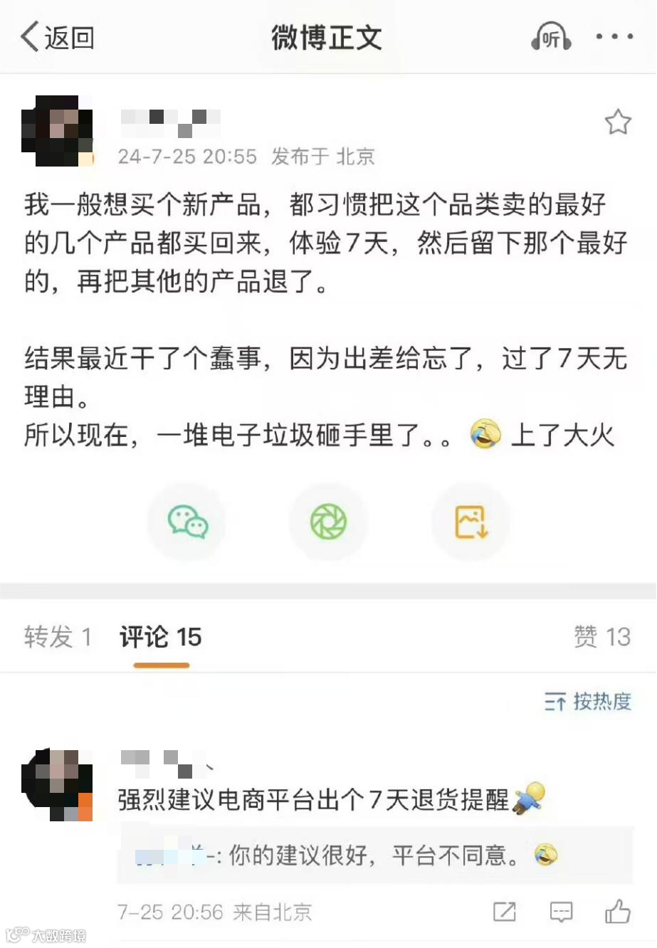 起因是这位产品经理发微博表示她一般想买个新产品,就会把这个品类卖的最好的几个产品都买回来,体验七天,然后把最好的那个留下来,其他的都一律退货。