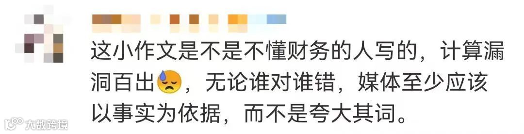 因此,消息曝光后,引发了不少网友的质疑。有网友评论,“这小作文是不是不懂财务的人写的,计算漏洞百出,无论谁对谁错,媒体至少应该以事实为依据,而不是夸大其词。”