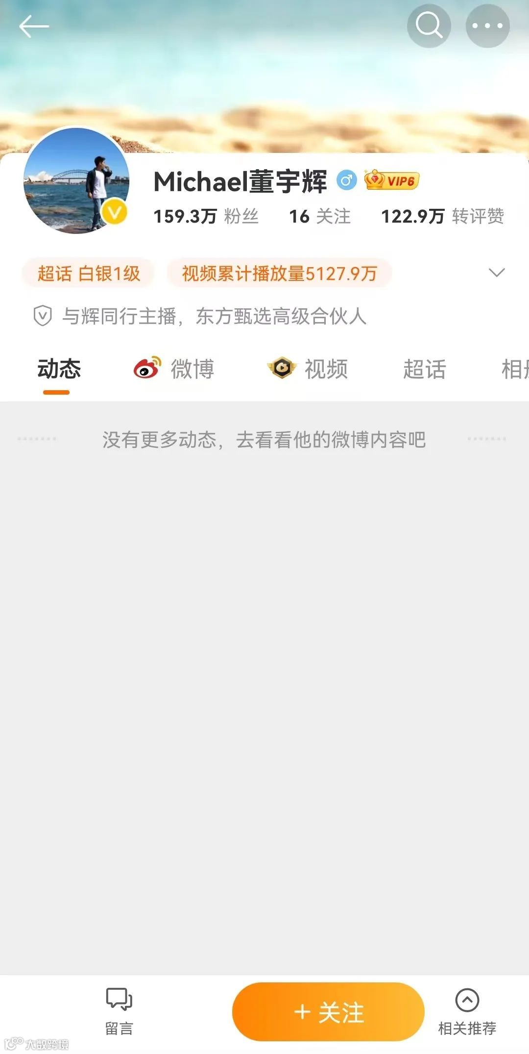 值得一提的是,在今年2月的时候,董宇辉曾因清空微博内容成为外界关注焦点。对此,董宇辉表示,“我解决不了被误解,只能逃离。”