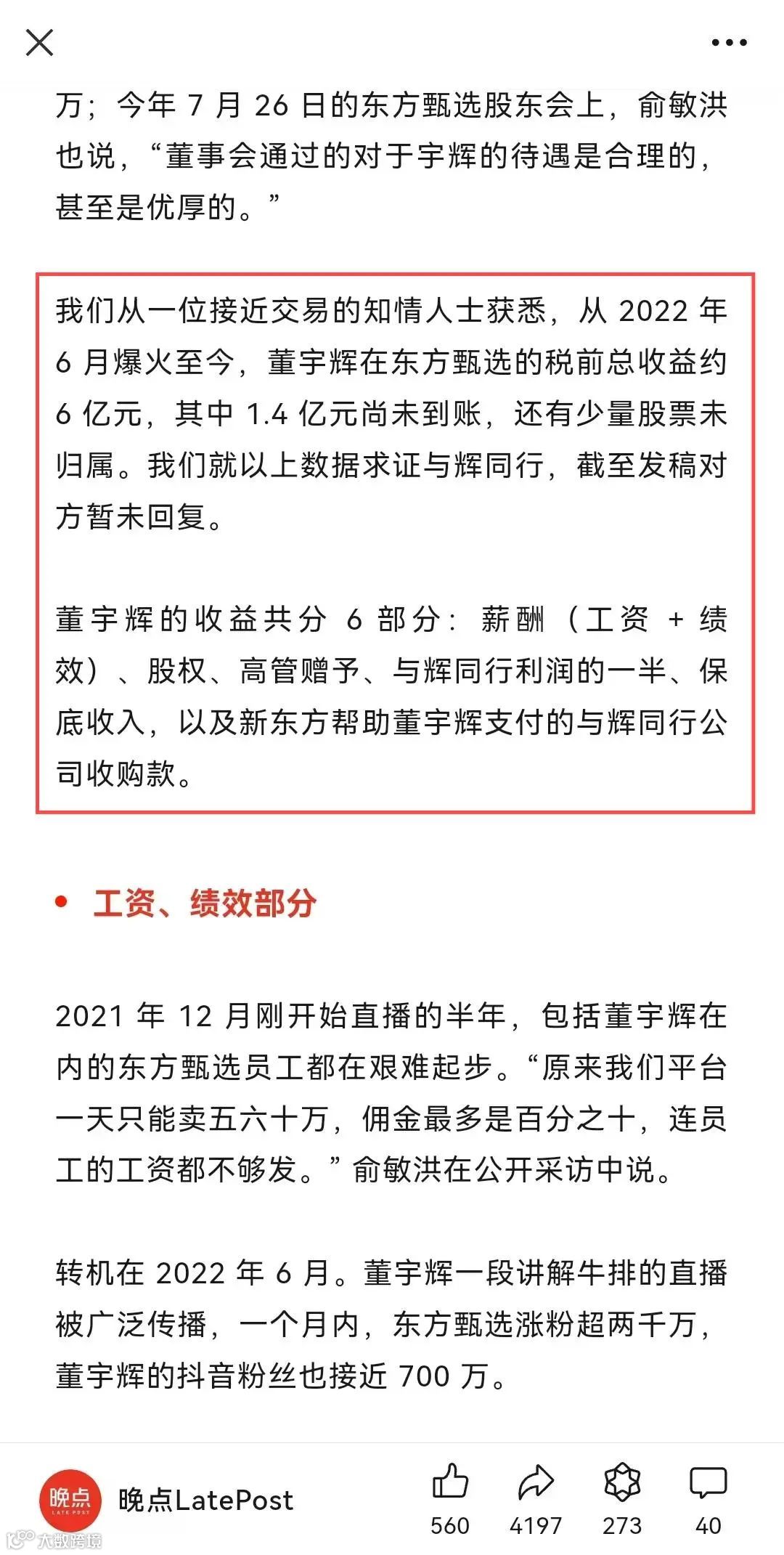 从一位接近交易的知情人士获悉,从2022年6月爆火至今,董宇辉在东方甄选的税前总收益约6亿元,其中1.4亿元尚未到账,还有少量股票未归属。