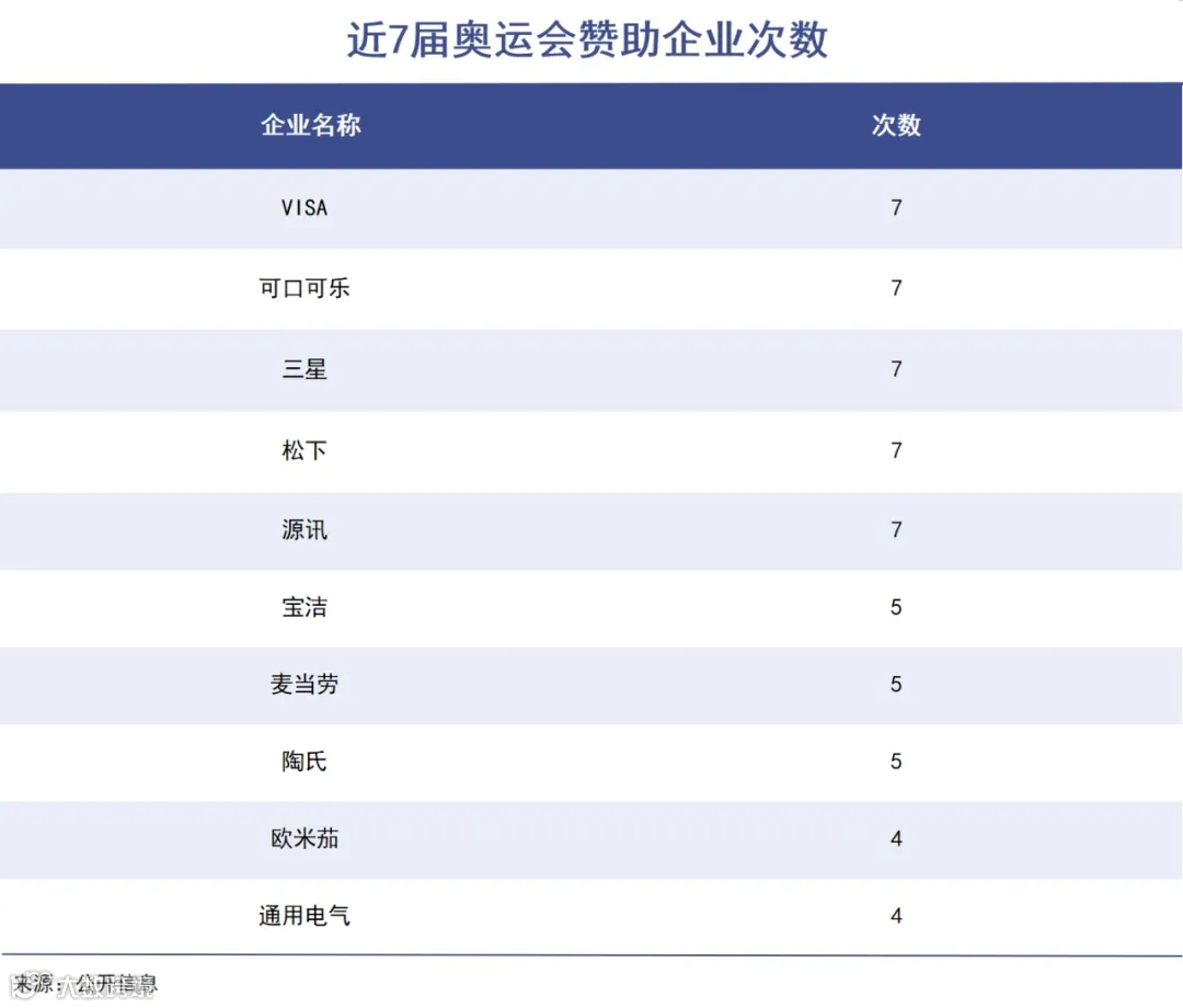 近7届奥运会的赞助企业,基本上都被像可口可乐、三星、宝洁等品牌包揽了。
