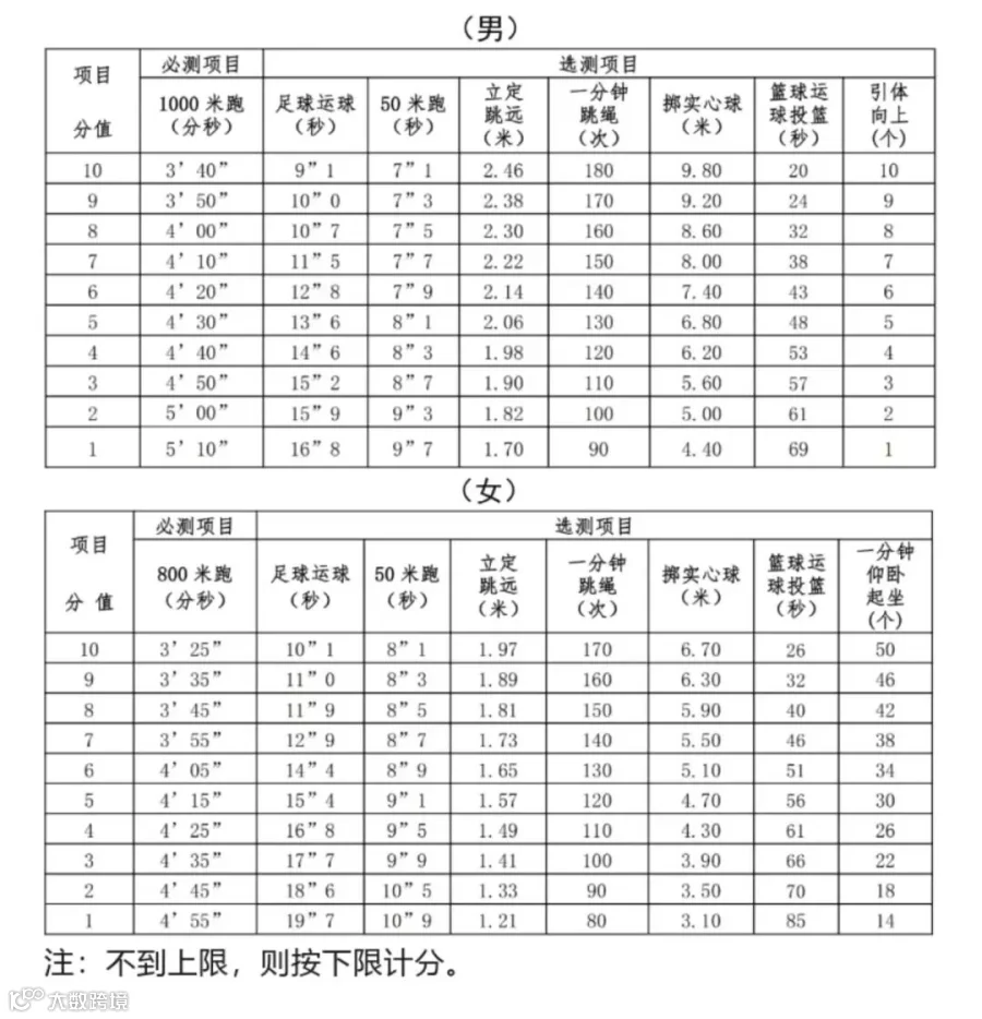 必测项目为中长跑(男生1000米,女生800米),分值10分。