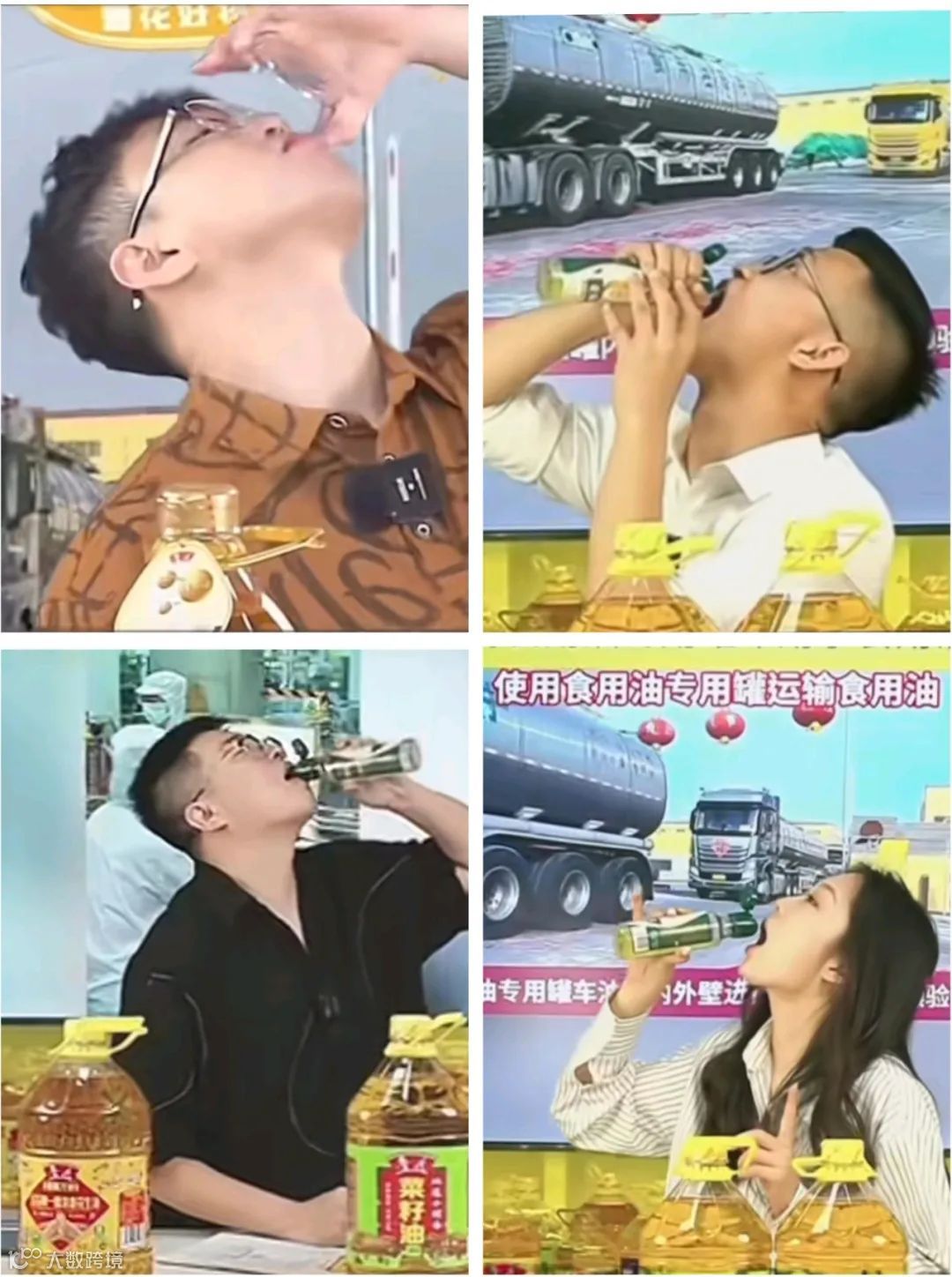 说这句话时,直播间背景还在反复播放据说是自有专用罐车运输食用油的画面。