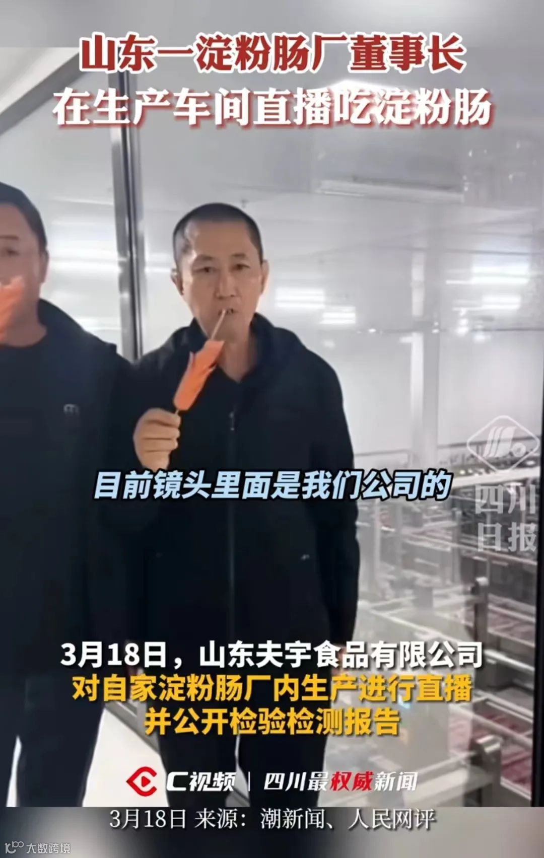 3月18日,夫宇食品公司董事长亲自直播展示生产车间,并试吃淀粉肠,还带记者抽检原材料,在线观看人次超2万。