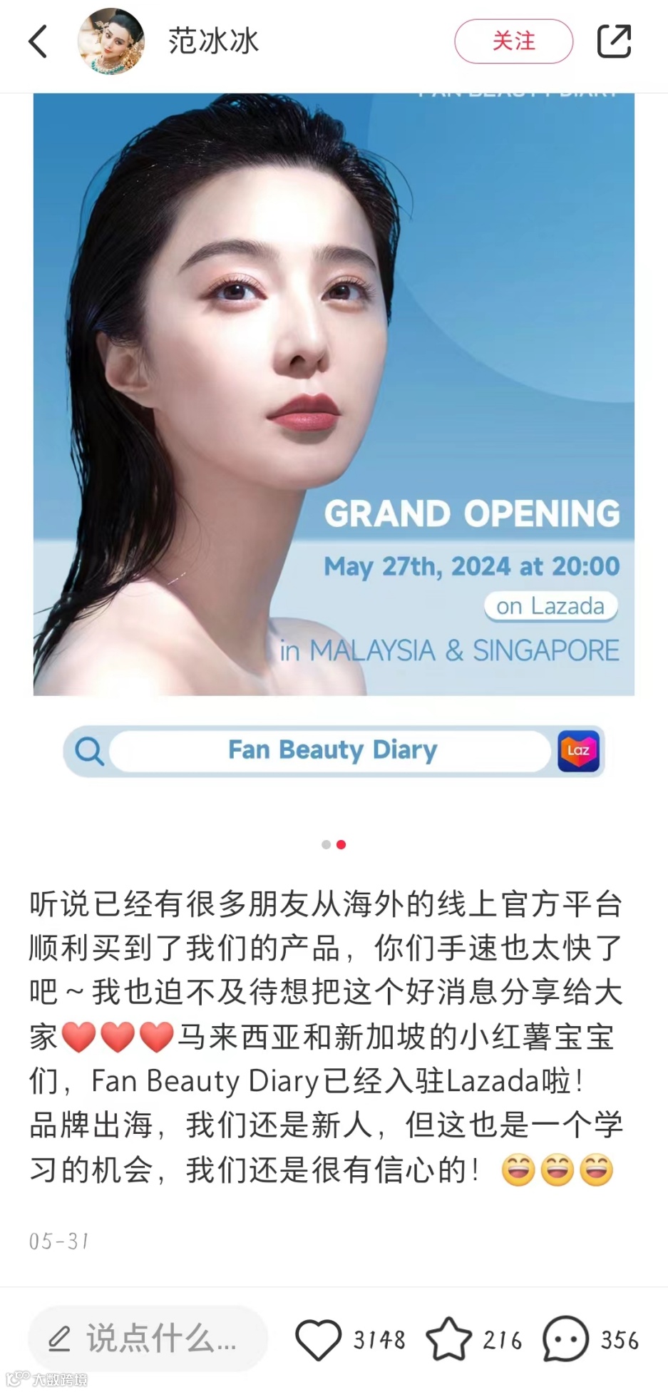 其实早在5月31日,范冰冰就在小红书的账号上号表示Fan Beauty Diary已经入驻Lazada(东南亚电子商务平台)。