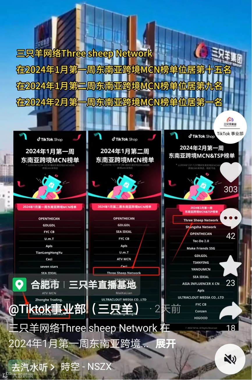 最终效果也不错。在今年1月份的前两周,三只羊网络Three Sheep Network分别拿下了东南亚跨境MCN榜单的第15名和第9名,在二月的第一周还拿到了榜单第一。
