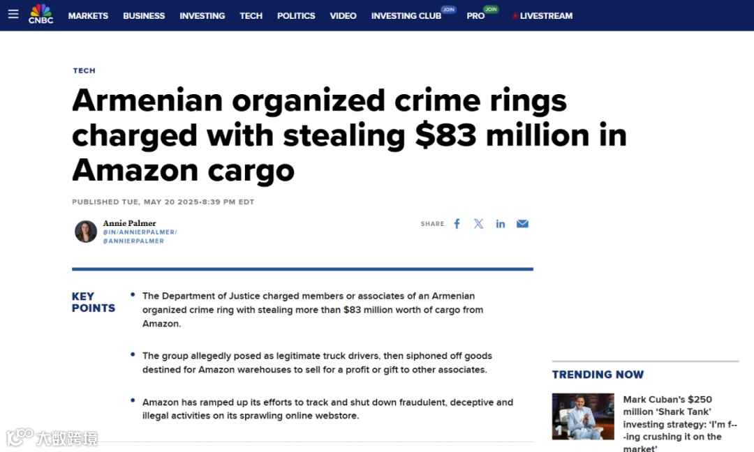 近期,美国CNBC曝光了一起亚马逊盗窃案件,美国司法部披露了一起涉案金额高达8300万美元(约合5.7亿元人民币)的亚马逊货物盗窃案,为国际供应链安全敲响了警钟。