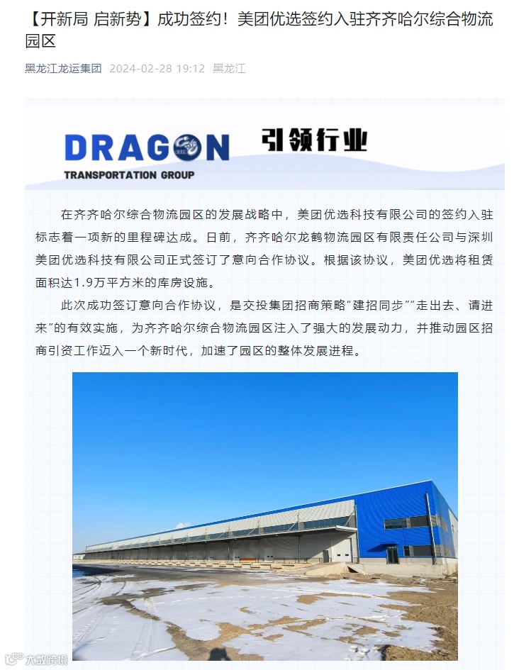 两个月前,美团优选签约入驻齐齐哈尔综合物流园区。根据协议,美团优选将租赁面积达1.9万平方米的库房设施。