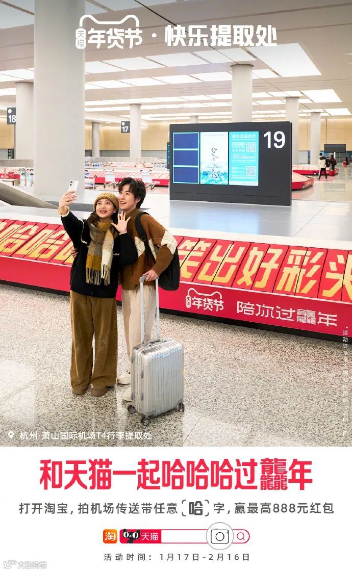以杭州萧山机场为例,在行李传送带上,天猫精心准备了一连串的“哈哈哈哈哈”字样。用户只需打开淘宝APP,扫描传送带上的任意一个“哈”字,便有机会赢取最高达888元的红包。这项充满趣味性的福利活动,不仅增加了用户对天猫的线下关注度,还拉近了平台与用户之间的距离。