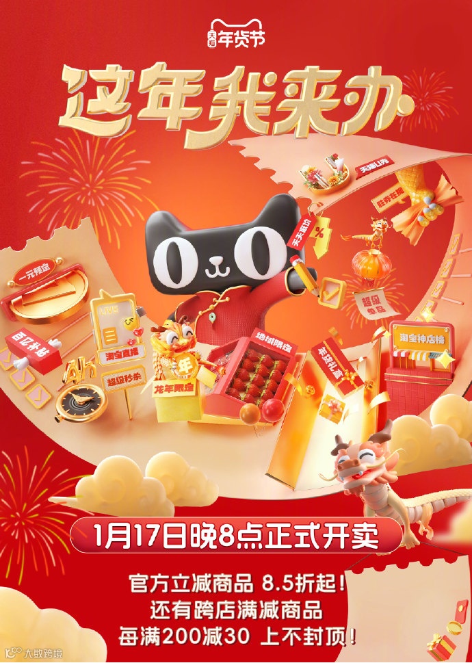1月17日晚8点至1月31日,天猫年货节狂欢购活动盛大开启,为期14天。在此期间,天猫为消费者带来了官方立减商品,8.5折起!还有跨店满减商品,每满200减30,上不封顶。