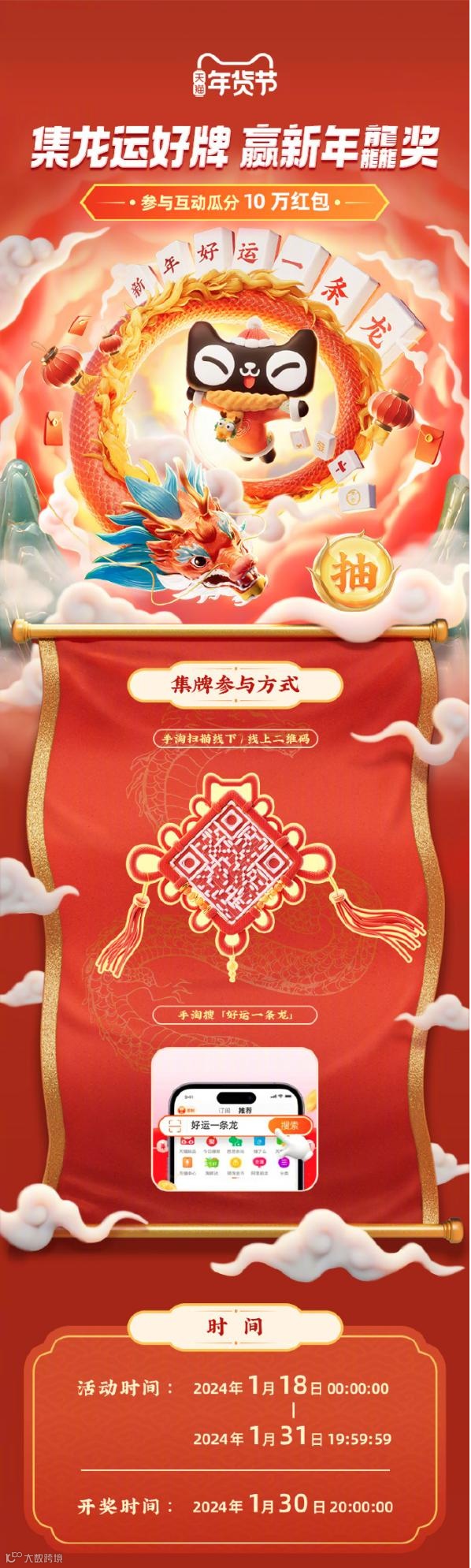 在活动进行时,用户上淘宝搜“天猫年货节”即可直达会场。同时,搜索「好运一条龙」还能参与天猫龙年集卡活动,集齐九张龙卡即可瓜分现金红包,还有各种天猫年货节定制好礼回馈给广大消费者。