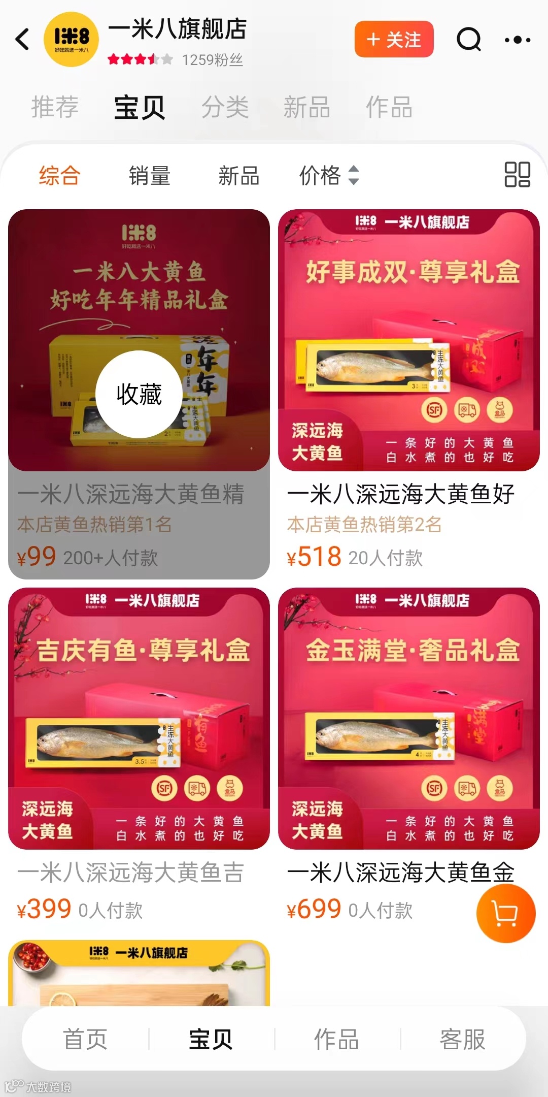 进入一米八天猫旗舰店也能看到,在售的有五款生鲜产品,均为礼盒包装的鱼类,其中“一米八深远海大黄鱼精品礼盒”销量超200+,其余产品销量较少。从包装方式看,这些产品很可能是为年货节准备的。