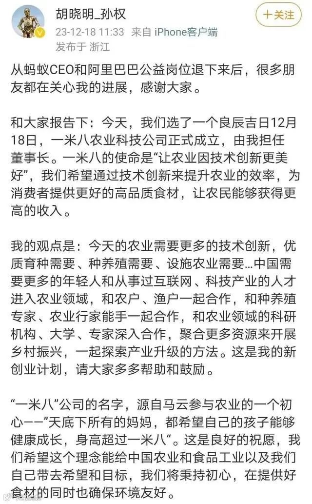 那么,马云的一米八究竟要做什么呢?去年12月18日,蚂蚁集团前CEO胡晓明在微博发文称,一米八农业科技公司正式成立,由他担任董事长兼首席品控官。他表示一米八的使命是“让农业因技术创新更美好”,希望通过技术创新来提升农业的效率,为消费者提供更好的高品质食材,让农民能获得更高的收入。