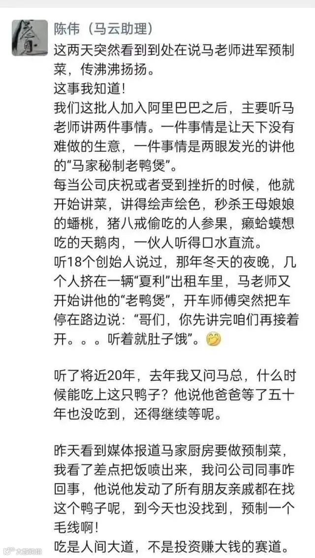 去年11月,一米八的“兄弟公司”杭州马家厨房食品有限公司成立,由于注册信息中含有“预包装食品”的经营项目,让外界误以为马云要做预制菜,不过很快马云前助理陈伟辟谣,称马云曾说:“吃是人间大道,不是投资赚大钱的赛道。”