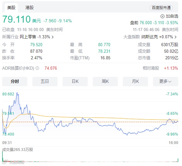 虽然财报的表现还差强人意,但阿里的股价却迎来了下跌,截至美股16日股价跌近9%。