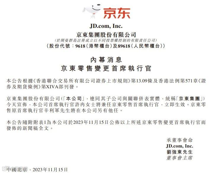 这一天,京东集团发布公告称,集团CEO许冉将兼任京东零售CEO,立即生效。京东零售原CEO辛利军则“另有他任”。