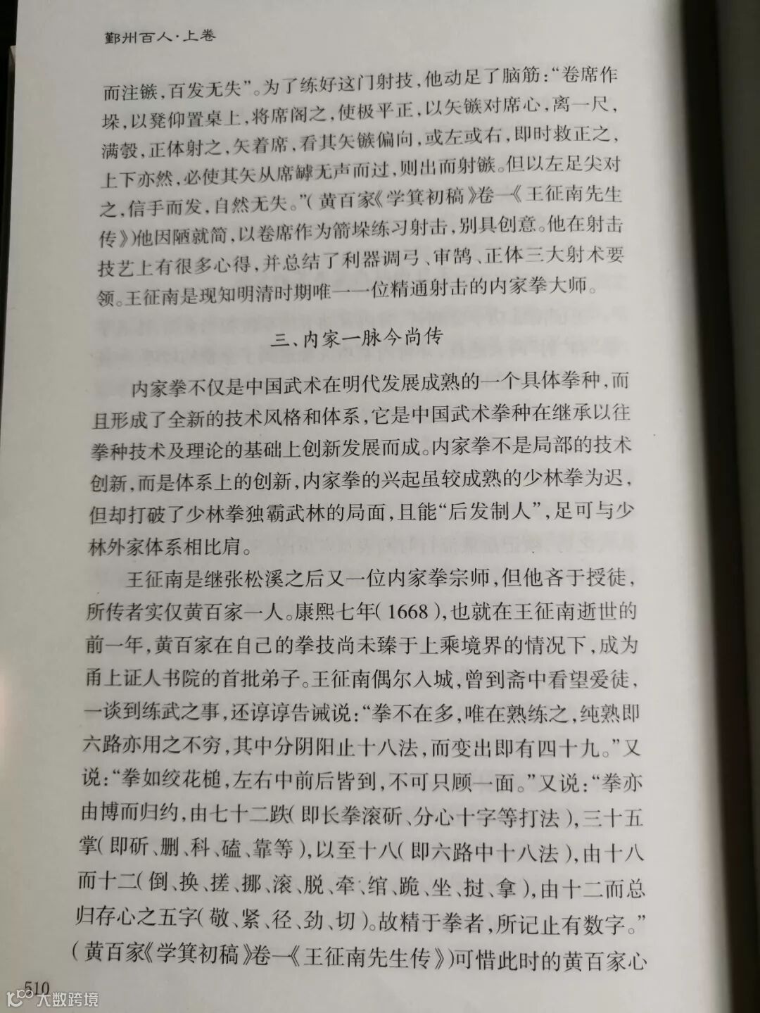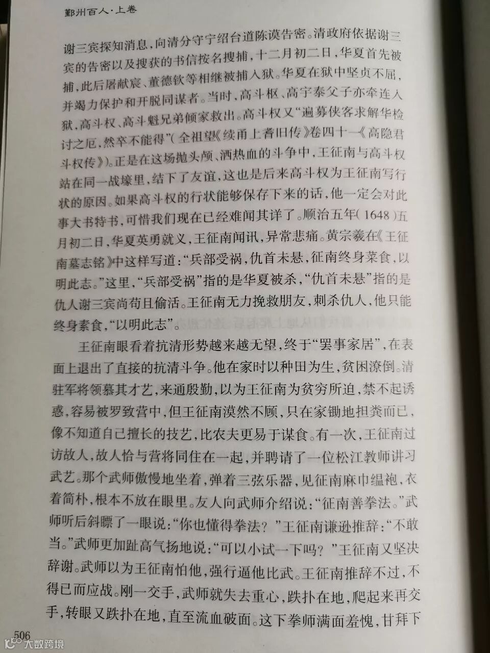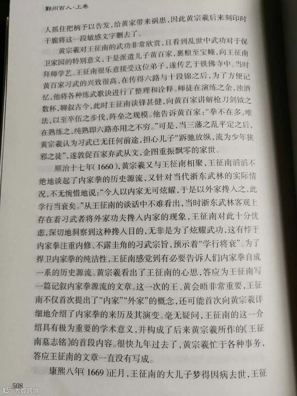 王征南没有读过书,但他与士大夫谈论,蕴藉可喜。根本看不出他是一个粗人。 黄宗羲、黄宗炎兄弟俩因为近侠的经历,都很亲近他。朱谦之《南雷学案》卷六将王征南列为黄宗義的同调,且有黄嗣芟按语云:“南雷公平生善拳法,如先生者皆其至友。”(朱谦之《南雷学案》卷六)说黄宗羲"善拳法”,尚缺乏史料佐证,但王征南是黄宗羲的至友则是可以肯定的。他们曾一起从事抗清斗争。笔者发现《四部丛刊》本黄宗羲《南雷集》所收《王征南墓志铭》有这样一段记载:“余弟晦木尝揭之见钱牧翁,牧翁亦甚奇之。当其贫困无聊,不以为苦,而以得见牧翁,得交余兄弟沾沾自喜。”这段话极为重要,可惜被后人忽略了,故在此略作考证。黄文所云的“晦木”即黄宗炎,钱牧翁即江苏常熟人钱谦益,为文坛宗师。读者不禁要问,黄宗炎去见钱谦益.为何要带上王征南?原来黄宗炎也是一位抗清志,钱谦益则暗中从事反清复明活动。顺治七年(1650)三月,黄宗義来到常熟拂水山庄拜会钱谦益,暗中商量策反金华镇将马进宝。据金鹤冲《钱牧斋先生年谱》,顺治八年(1651),当清大兵云集东南海滨,浙东形势高度紧张之际,钱谦益来到浙江嘉兴会晤黄宗炎,为黄宗炎作书介绍见马进宝。钱谦益在《致口口口》书中说:“余姚黄晦木奉访,裁数行附候,计已达铃阁矣。友人陈昆良赴温、处万道尊之约,取道金华,慨慕龙门,愿一投分..介恃道谊之雅,辄为绍介....晦木知必荷眄睐,先为遥谢。”这里的口口口,当指马进宝。黄宗炎带上王征南会晤钱谦益,大概就在其时。也就是说,王征南秘密卷入了黄氏兄弟联络钱谦益反清复明的地下活动,并暗中保护、协助黄宗炎。虽然黄氏兄弟、钱谦益的策反工作未获成功,但王征南为借此机会得以拜会文坛宗师钱谦益而倍感荣耀。这段文字也证明,自华夏被杀之后,王征南并非总是“罢事家居”,他的心并非成死灰,仍在寻觅时机东山再起,正因为王征南所卷入者属于高度机密事件,有可能被人抓住把柄予以告发、给黄家带来祸患,因此黄宗羲后来刻印时干脆将这一段敏感文字删去了。