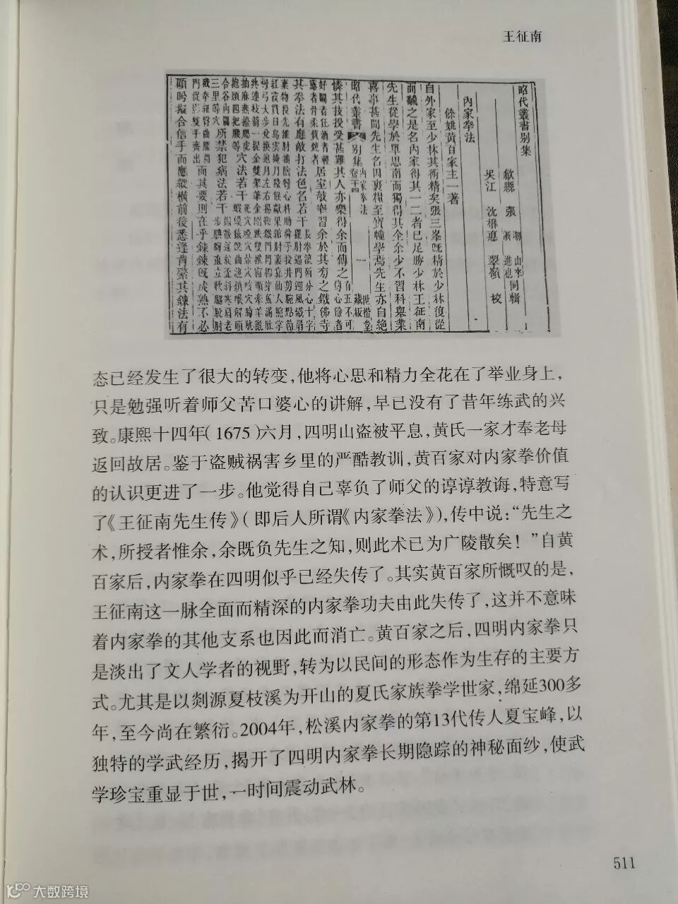 明代新拳种内家拳的出现,不啻是中国武术发展史上的一次革新与飞跃。文献对内家拳确切含义记载不详,对于“内家拳”的释义也是众说纷纭、莫衷一是。但所有人都会 提到黄宗羲在《王征南墓志铭》开篇的阐释:“少林以拳勇名天下,然主于搏人,人亦得以乘之。有所谓内家拳者,以静制动,犯者应手即仆,故别少林为外家。”此说一出,开启了我国武术的内外家之分。自孙十三老以来,内家拳师择徒甚严。张松溪虽然身怀绝技,负拳名五十年,但“其法不轻授人,必慎试再三,知其诚信始许纳贽"。因此,张松溪的徒弟极少,得其真传者仅叶继美一人。继美传吴昆山、周云泉、单思南、陈贞石、孙继槎,昆山传李天目、徐岱岳、余波仲、吴七郎、陈茂弘,云泉传卢绍歧,思南传王征南,贞石传董扶舆、夏枝溪,继槎传柴元明、姚石门、僧耳、僧尾。这些四明内家拳师以王征南最负盛名。