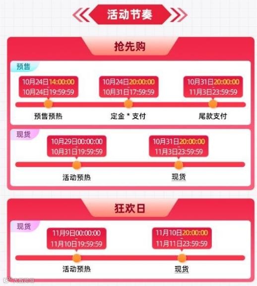 天猫双11今年活动节奏依然为三段,和去年双11保持了一致。分别为10月24日14点-11月3日24点的抢先购预售、10月29日0点-11月3日24点的抢先购现货、11月9日0点-11月11日24点的狂欢日现货。
