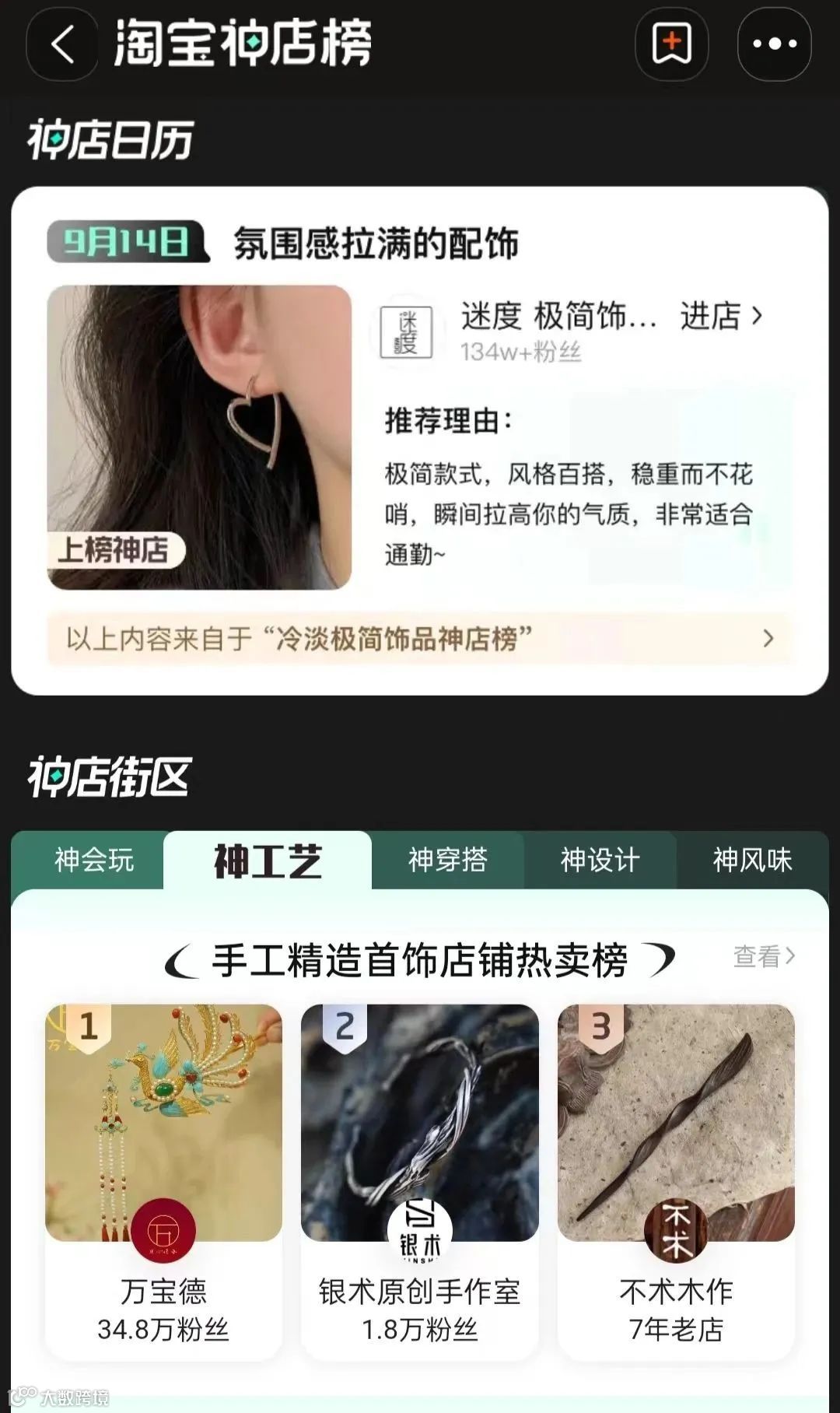 不仅如此,神店榜还在站内对频道进行了全面升级改造,淘宝不仅在频道顶部置顶了非遗手艺人的专属海报和代表性手艺,还通过详细的文案对他们的手艺进行专业细致的讲解,助力店铺精准高效引流,并在站内上线了神店日历和神会玩、神工艺、神穿搭、神设计和神设计四大街区,满足了消费者捕捉当下热门消费潮流、找到对应圈层内好店的发现性需求。