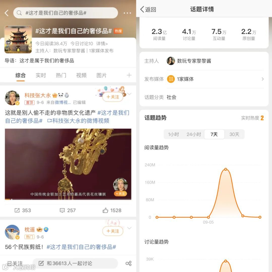 以微博为例,淘宝神店榜基于非遗手工艺传承千年蕴含的历史文化价值和年轻消费群体对传统文化饱含的民族自豪感和自信心的洞察,在微博以话题#这才是我们自己的奢侈品#登上全国热搜,话题阅读量突破2.3亿,成功激发了年轻网友对非遗相关内容的广泛关注以及讨论。此外,经过四川共青团、鲜城南京、青年湖南等10家蓝V的跟发讨论,该话题还引导了不少年轻群体积极转发和分享个人对非遗的观点和看法,进一步扩大了神店榜IP的传播影响力。