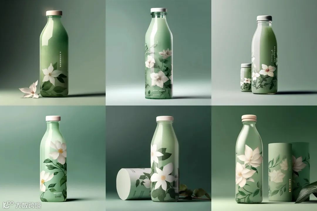 当用户选定奶茶类目,为产品风格设定为“简约质感”、“清新质感”,并在配色方面选择“森林”、“绿色”,要求增添“山茶花”、“绿茶”元素后,就能够在包装类型PET瓶装、容量规格350ml的要求下,给出相应的产品概念图,满足用户对爆款美食包装的即时需求。