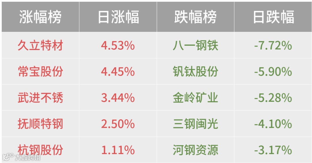01月27日,上证综指报收4139.90点,上涨0.18%,深证成指报收14329.91点,上涨0.09%,创业板报收3342.60点,上涨0.71%,沪深300报收4705.69点,下跌0.03%。SW 钢铁行业下跌1.34%,跑输大盘1.31个百分点。行业个股方面,久立特材、常宝股份、武进不锈、抚顺特钢、杭钢股份涨幅居前,八一钢铁、钒钛股份、金岭矿业、三钢闽光、河钢资源跌幅居前。