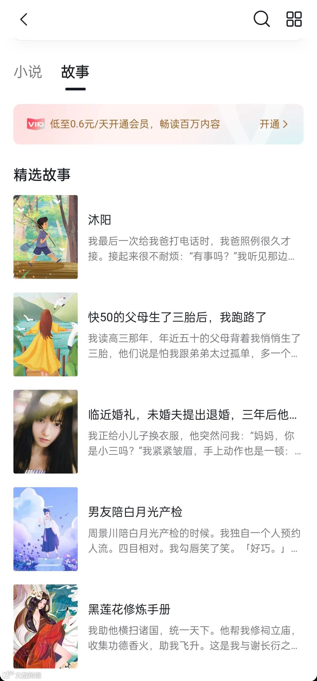 打开“我的读书”可以看到,首页默认展示的是“故事区”,偏向情感文;“小说区”则需要用户主动点击才能进入,包括玄幻、言情、穿越等经典网文类型。