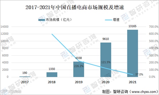 数据显示,2021年中国直播电商市场规模增速断崖下跌,仅为37%。此前两年直播电商的市场规模增速分别为226.2%和121.5%。