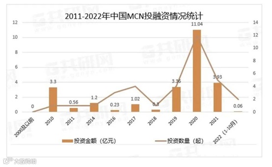 数据显示,2021年我国MCN市场投融资金额完成3.93亿元,到了2022年1-10月锐减到0.06亿元,对比十分明显。