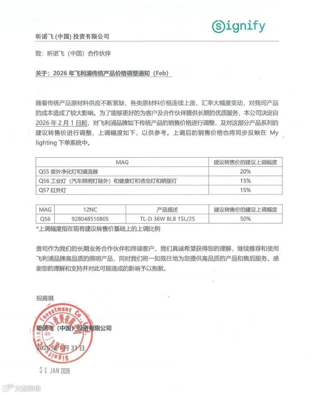 1月31日,昕诺飞(中国)投资有限公司宣布,自2026年2月1日起上调飞利浦品牌多款传统照明产品的销售价格,以应对原材料紧缺、价格上涨及汇率波动带来的成本压力。